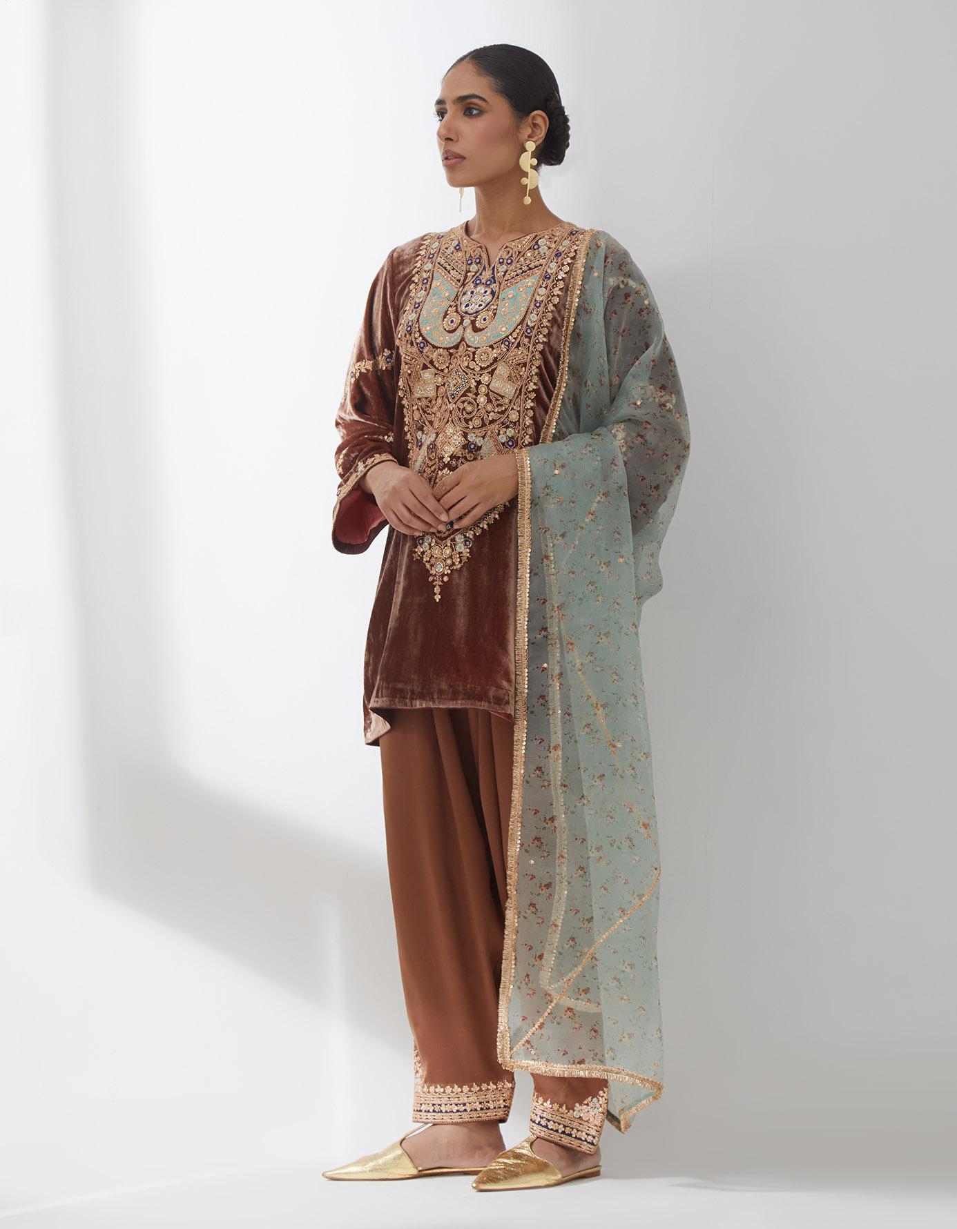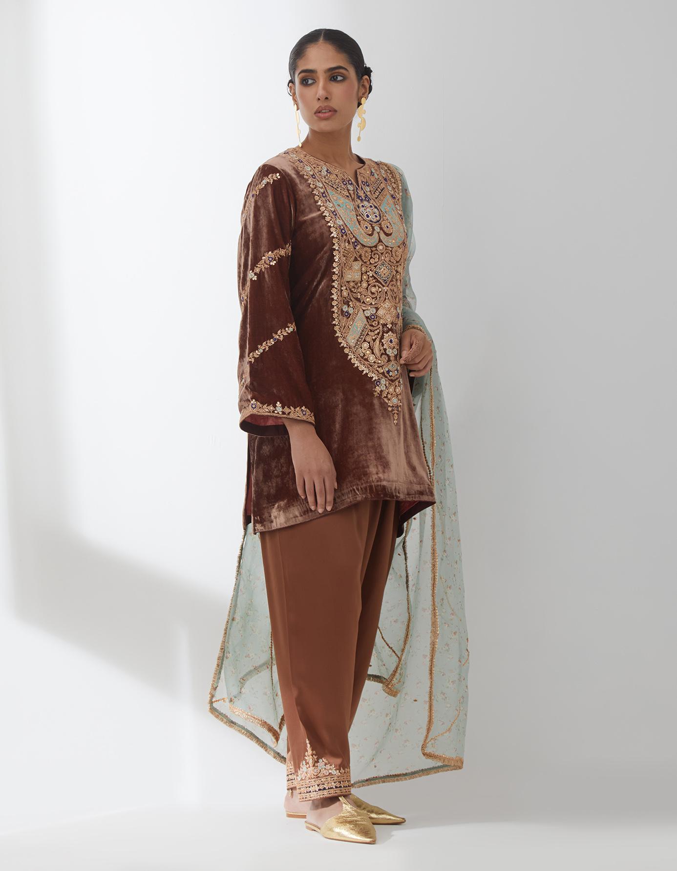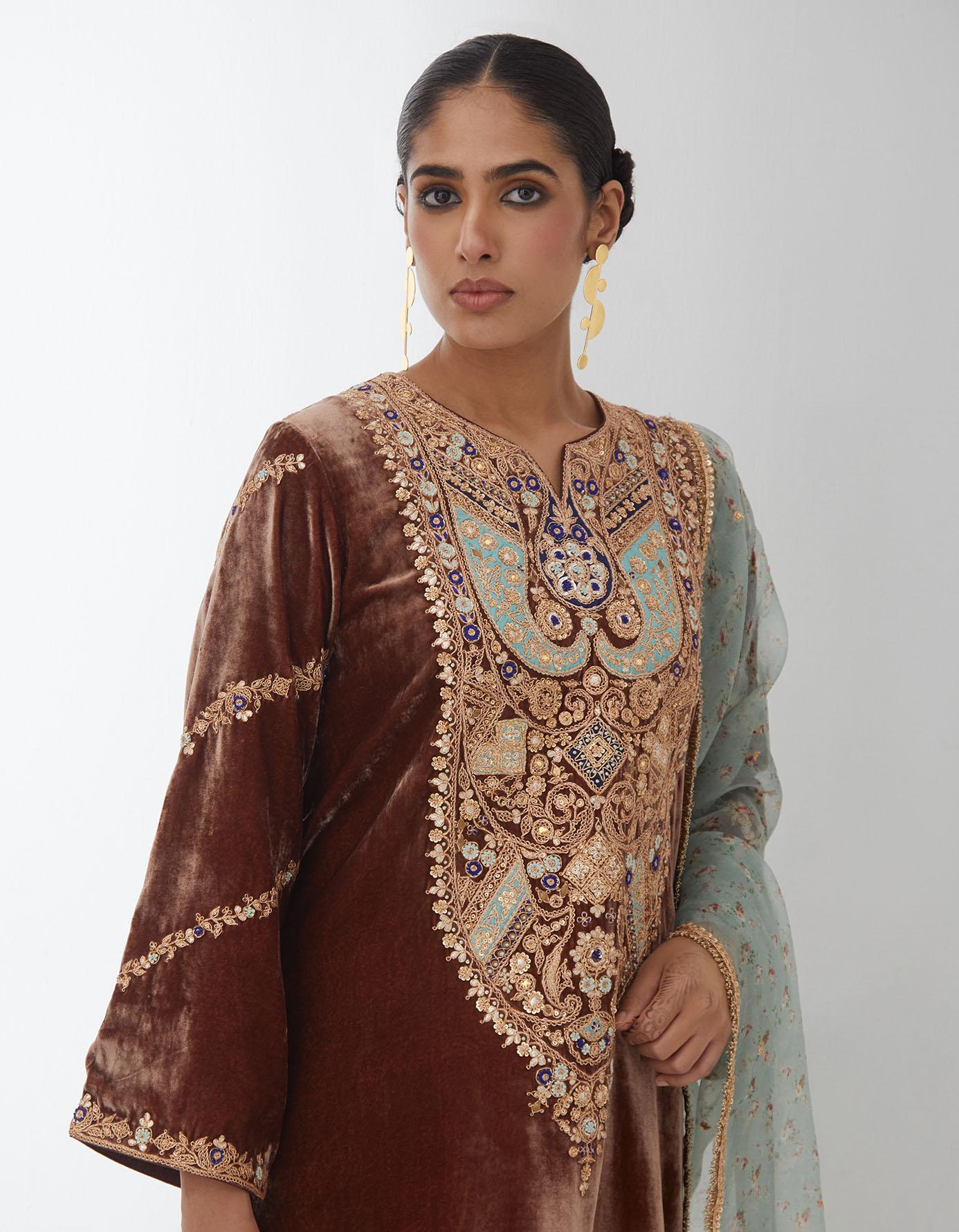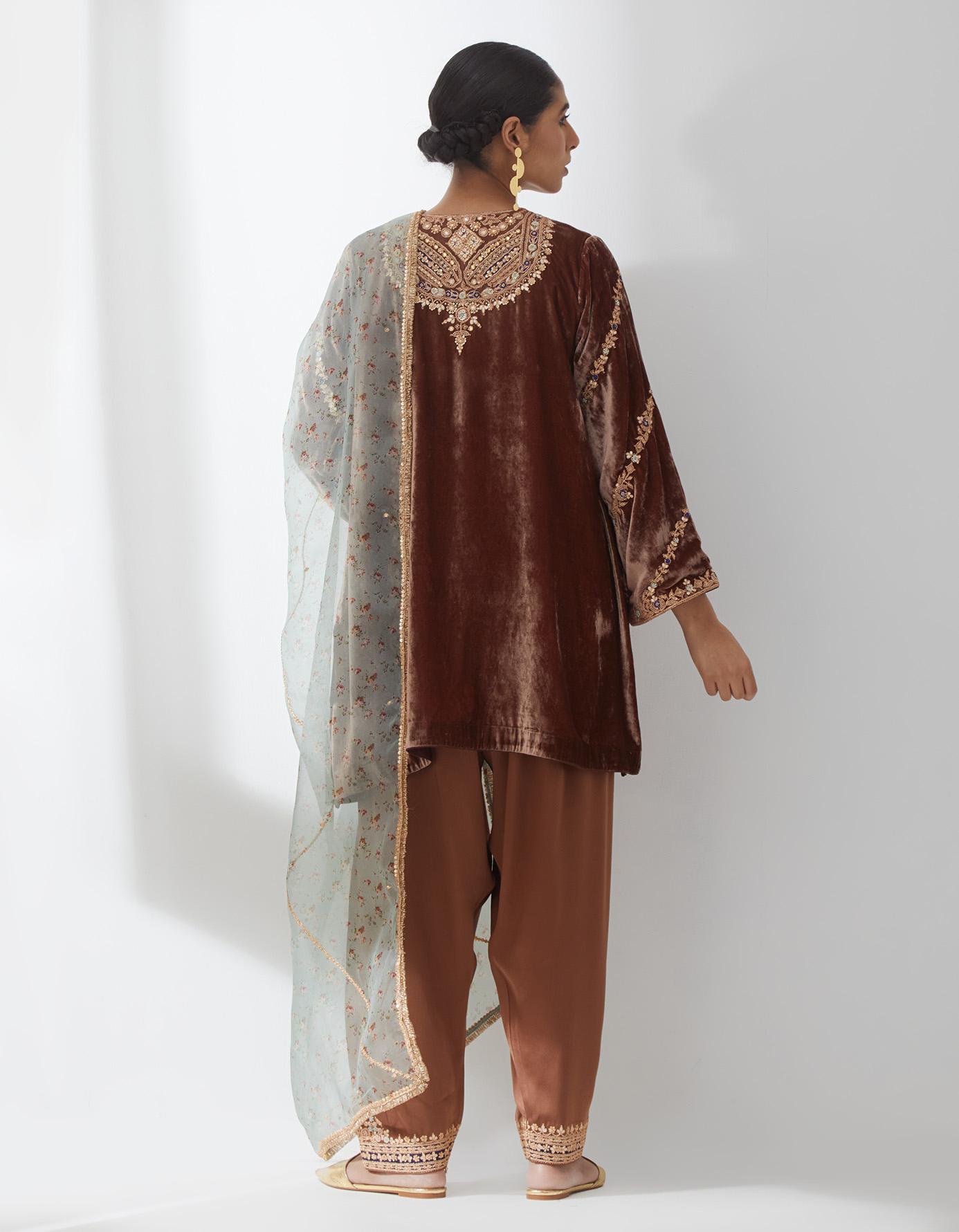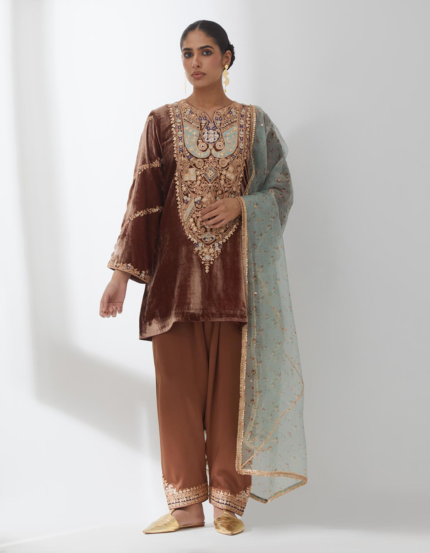 • Fabric - kurta - silk velvet; pants - silk satin; dupatta - silk organza