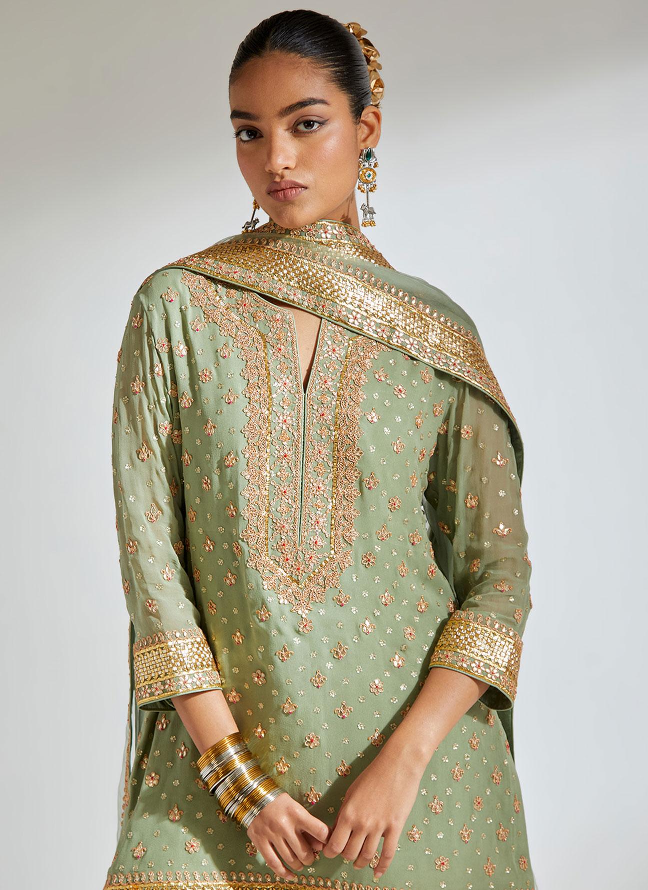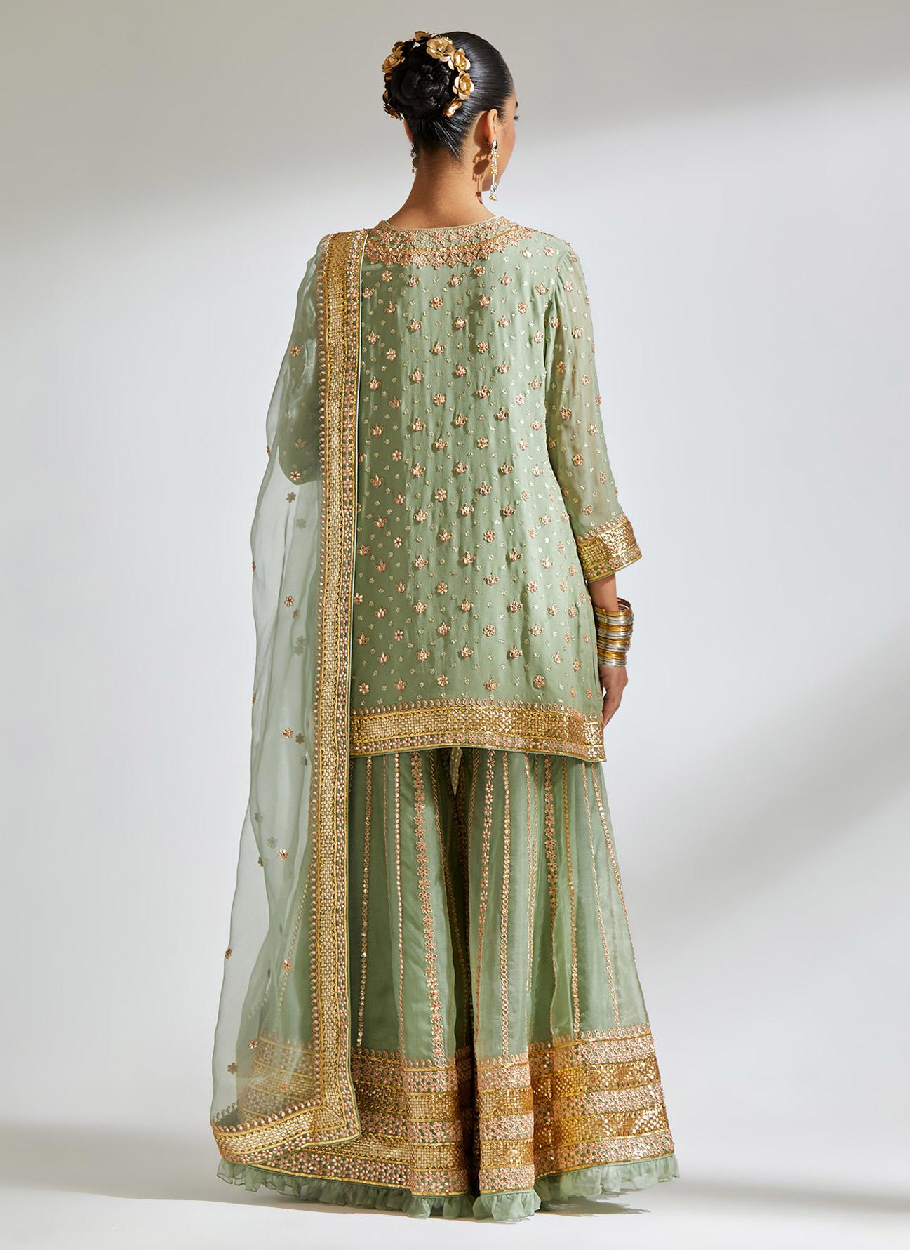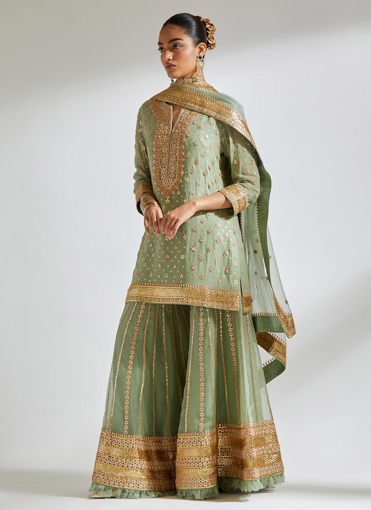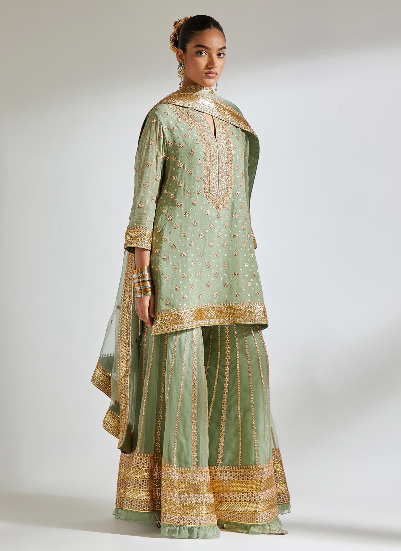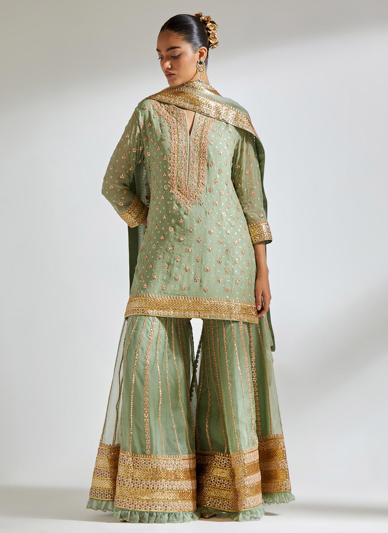 • Fabric: kurti - silk georgette, sharara - silk organza, dupatta - silk organza