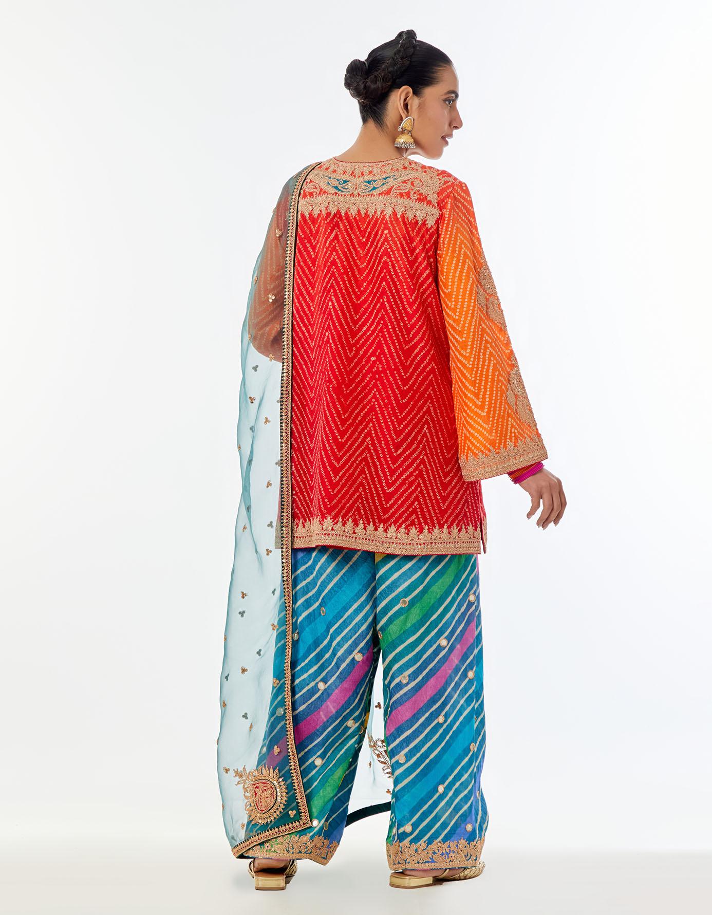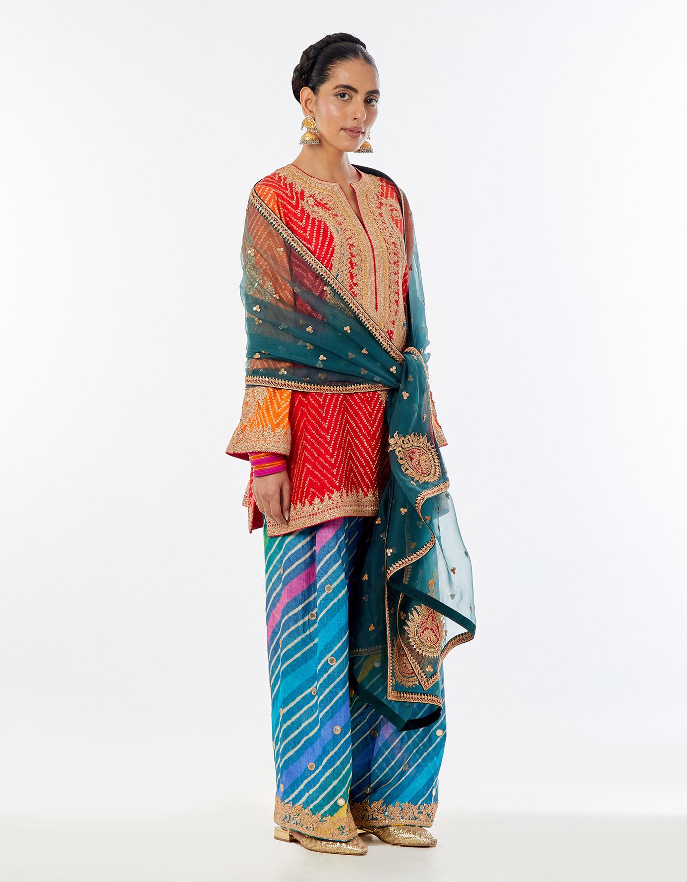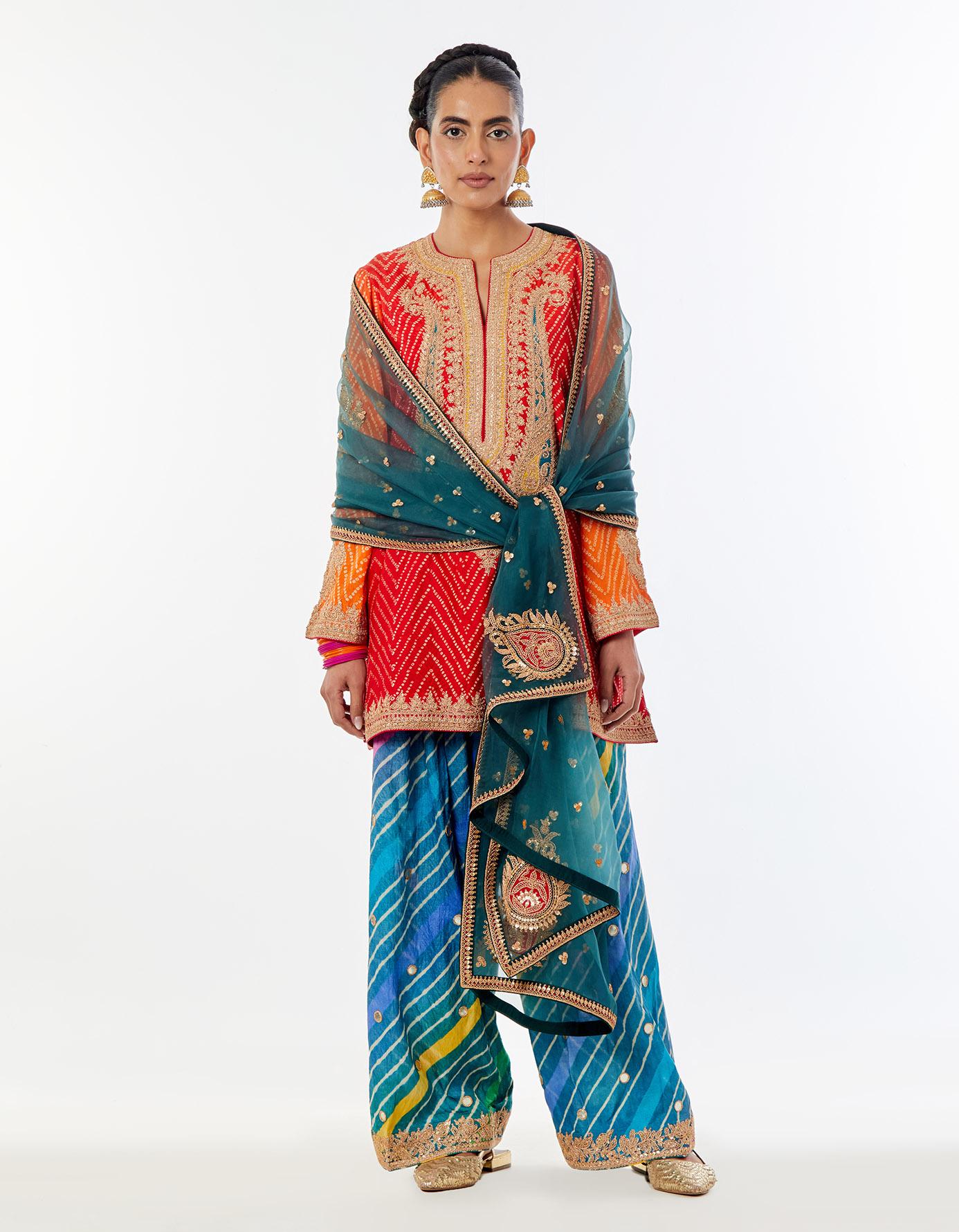 • Fabric: kurta - bandhni silk, izar - tussar munga, dupatta - silk organza