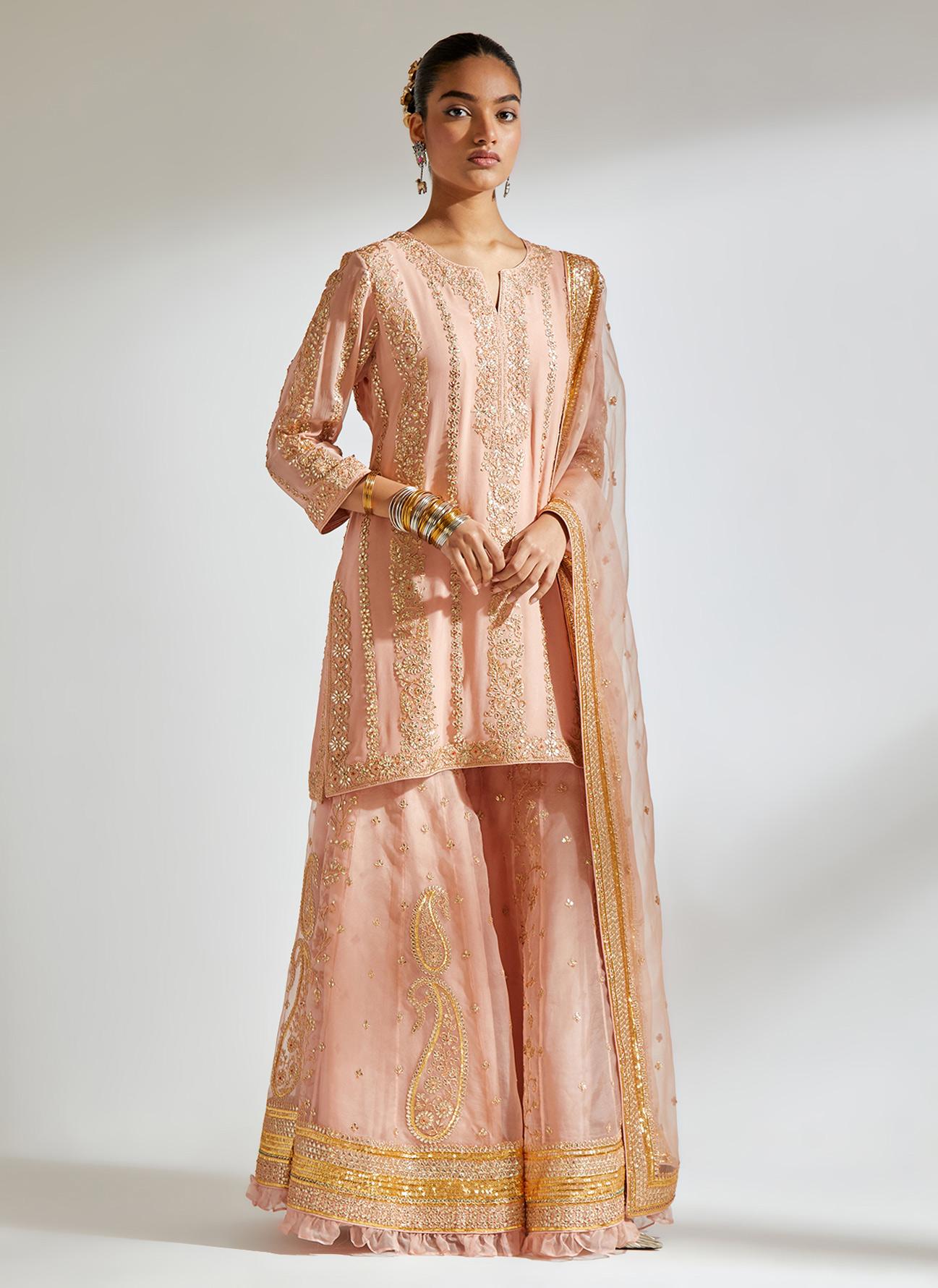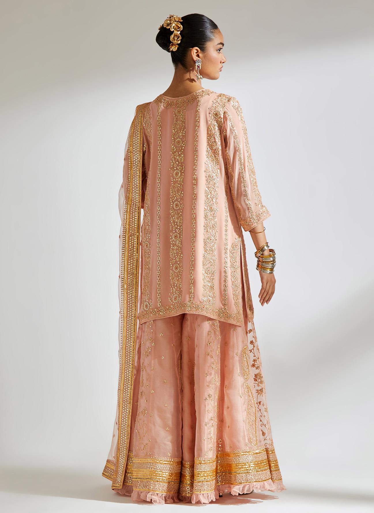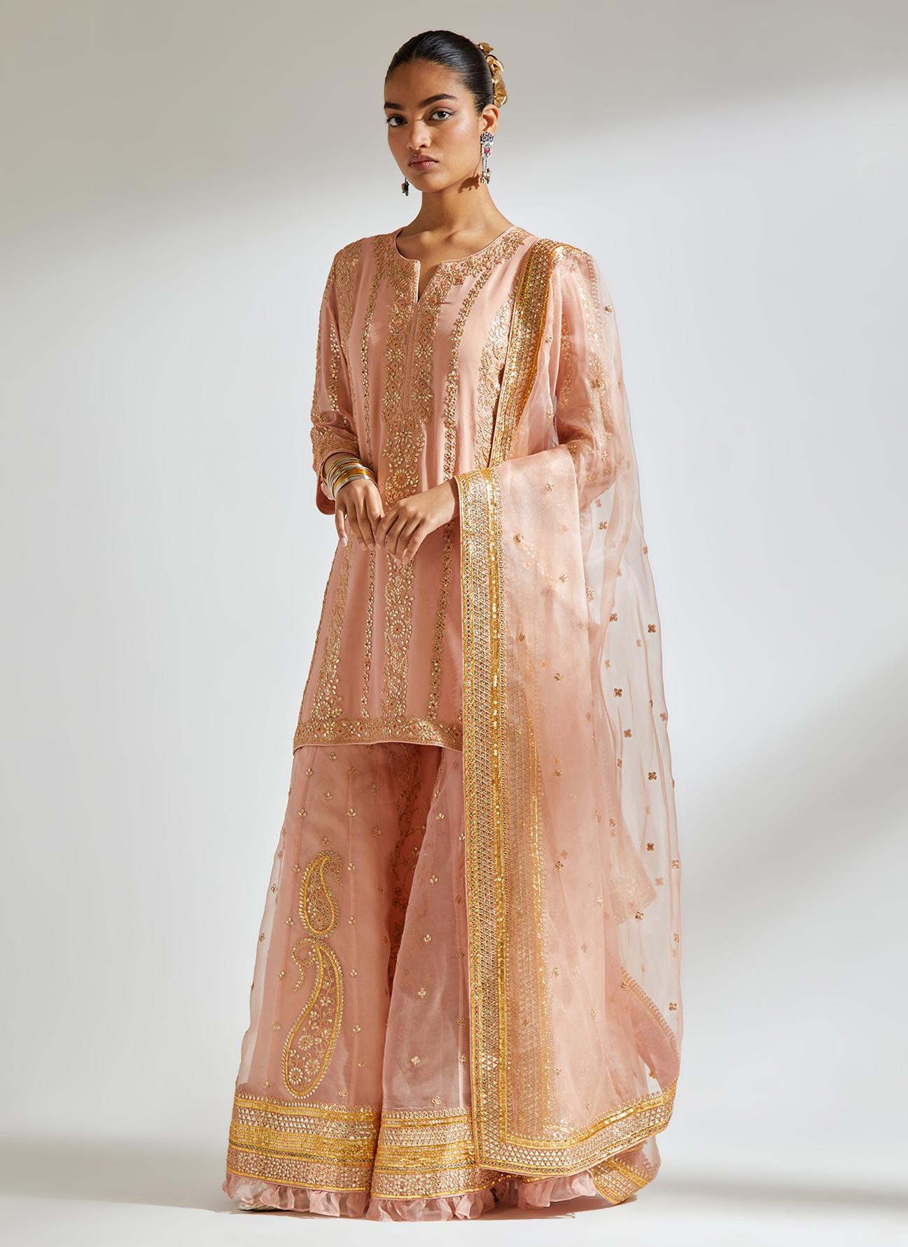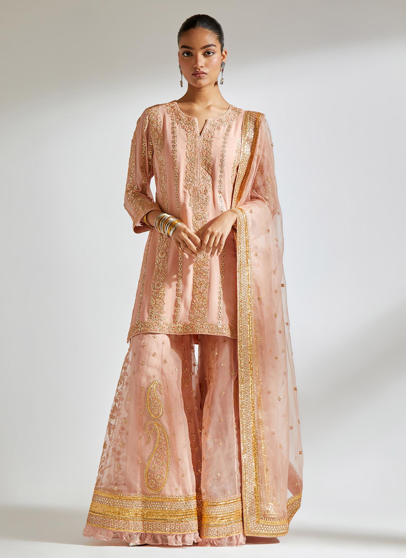 • Fabric: kurti - silk georgette, sharara - silk organza, dupatta - silk organza