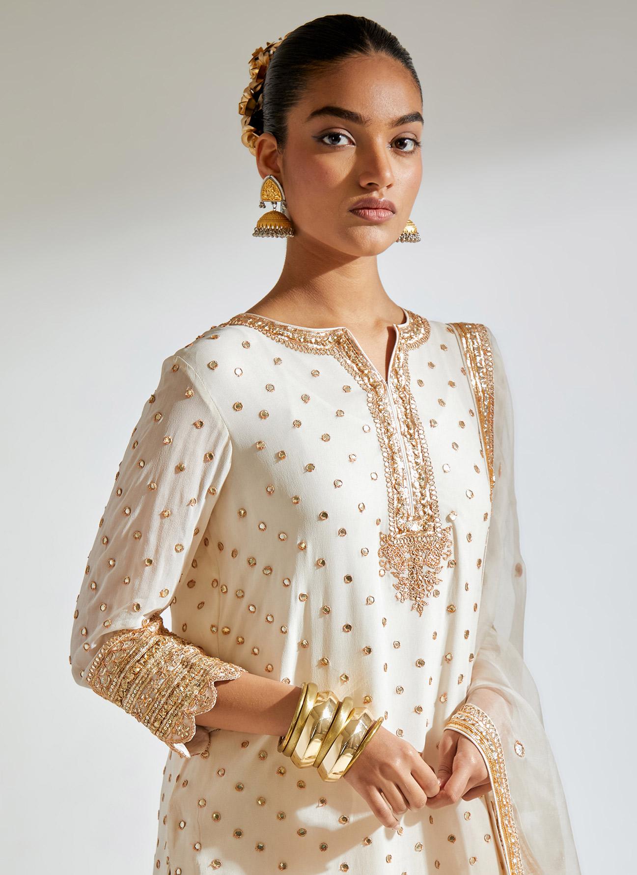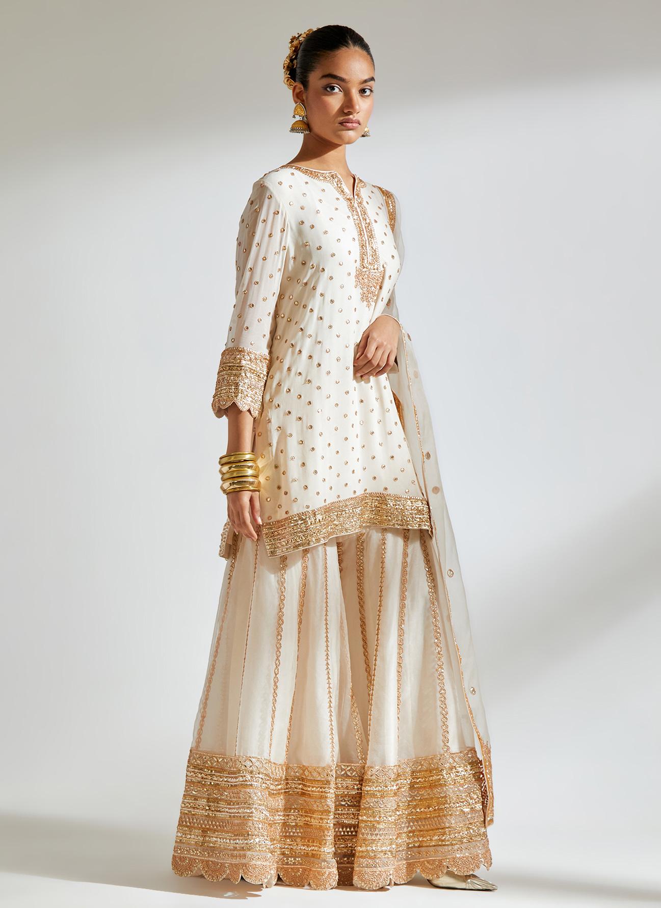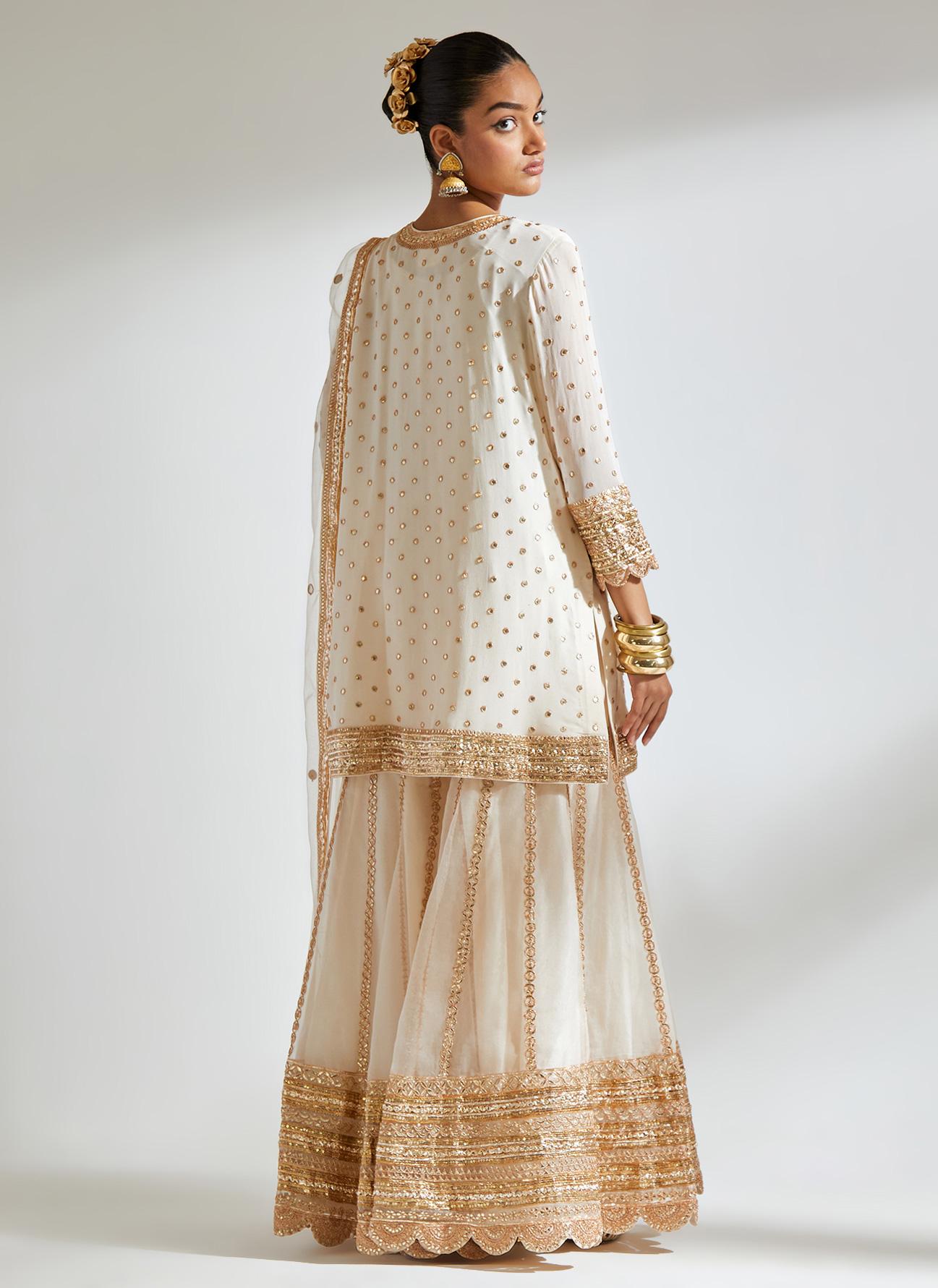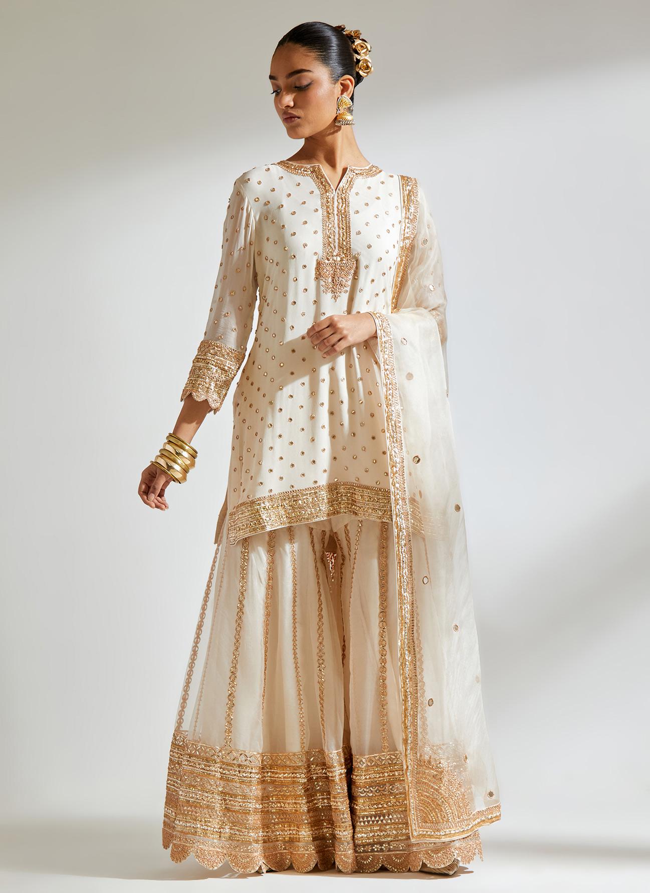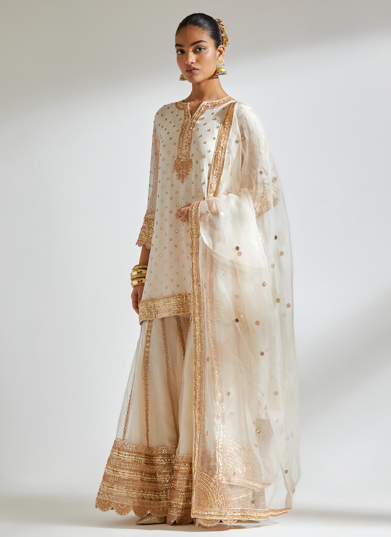 • Fabric: kurti - silk georgette, sharara - silk organza, dupatta - silk organza