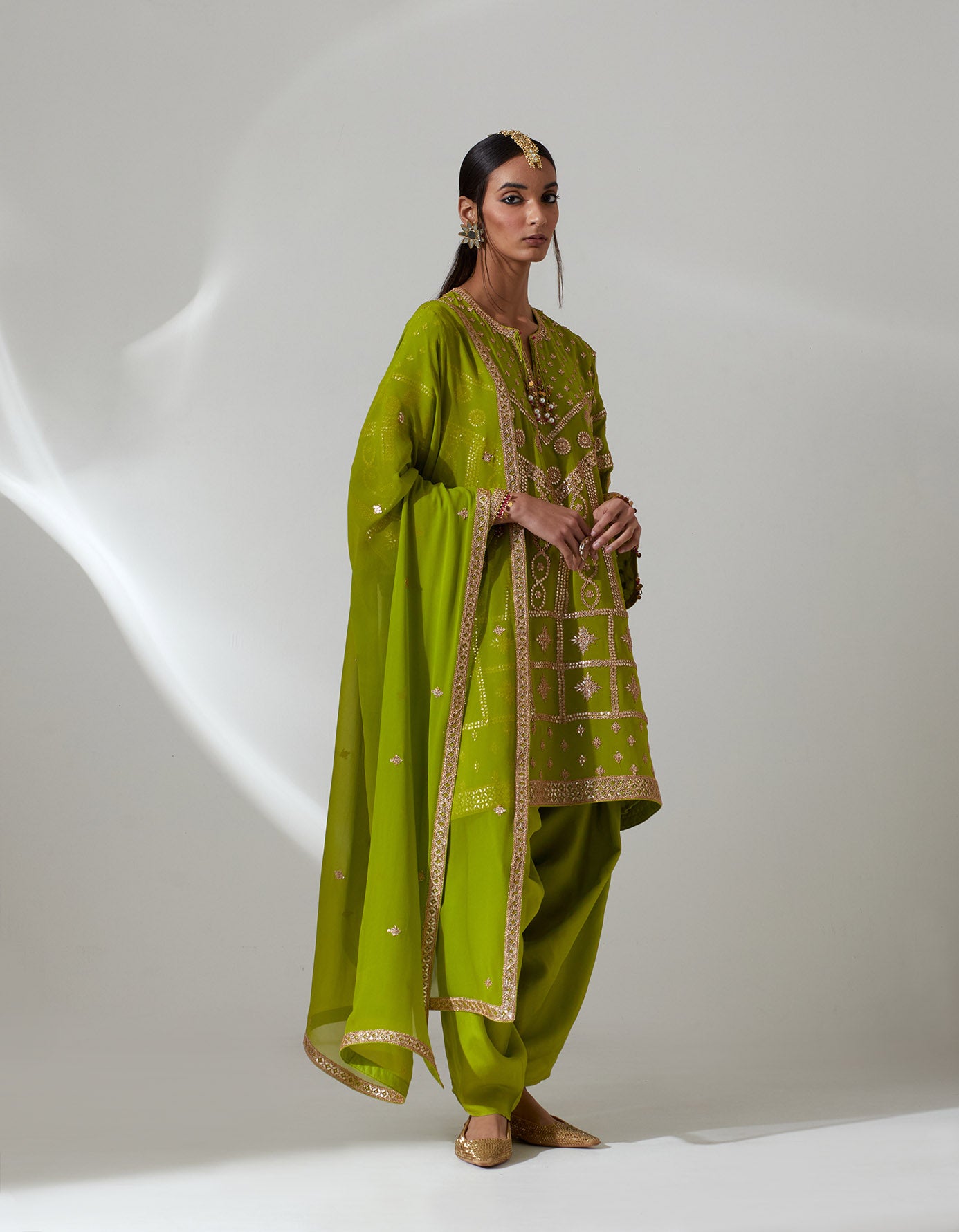 Lime Green Georgette Kurta with Silk Tulip Pants and a Dupatta